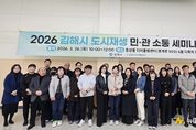 정기적 민관 협력체계 구축, 공모·지원사업 안내로 현장 실효성 강화 - 김해시도시개발공사, 도시재생 민·관 소통 세미나 개최 - 민간 운영주체–공공기관 간 정기적 소통체계 구축 - 공모사업 및 지원사업 안내 중심 실질적 정보 제공 - 분기별 운영을 통한 민·관 협력 거버넌스 강화 추진 김해시도시개발공사는 지난 26일 동상동 다어울림센터에서 '2026 김해시 도시재생 민·관 소통 세미나(1차)'를 개최하고, 도시재생사업의 협력 기반 강화를 위한 소통의 장을 마련했다. 이번 세미나는 도시재생사업의 효과적인 추진을 위해 도시재생 거점시설 민간 운영주체와 공공기관 간 정기적인 소통체계를 구축하고, 현장 운영 현황과 정책 동향을 공유하기 위해 추진됐으며, 분기별로 연 4회 운영될 예정이다. 특히 이번 세미나는 도시재생 관련 다양한 지원사업과 공모사업 정보를 안내하고, 현장에서 실질적으로 활용할 수 있는 내용을 중심으로 구성하여 참석자들에게 실질적인 도움이 되는 자리가 되도록 마련됐다. 이날 행사에는 김해시도시개발공사를 비롯해 김해시 도시디자인과, 김해의생명산
