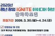 대구 북구청은 지역 청년들의 창업 열정과 혁신적인 아이디어 발굴을 지원하기 위해 오는 4월 24일까지 '청년 창업 Ignite 아이디어 허브' 참가자 20팀을 모집한다. 이번 사업은 지역 청년 (예비)창업자들이 보유한 창업 아이디어에 ‘점화(Ignite)’의 계기를 제공하여 사업화 가능성을 구체화하고 현실화할 수 있도록 단계별로 지원할 예정이다. 참가 대상은 2026년 청년놀이터 멤버십 회원 또는 창업놀이터 입주기업, 현재 39세 이하(1986년 3월 31일 이후 출생)인 북구 지역 청년 (예비)창업자이다. 북구 거주자․북구 소재 기업 재직자․북구 소재 대학생(휴학생)․북구 관내 창업 3년 미만 기업 중 1개 이상 요건을 충족하면 참가할 수 있으며, 이메일로 신청하면 된다. 선발된 팀에는 월 2회 이상의 협업 공간 이용 지원, 팀당 활동비 50만 원이 지원되며, 성과발표회를 통해 상위 7팀에는 총 310만 원 규모의 시상금이 수여될 예정이다. 배광식 북구청장은 “청년이 가진 아이디어 하나가 미래를 밝히는 불꽃이 될 수 있도록 지속적으로 청년이 도전할 기회를 제공하고 대구 북구를 청년 창업의 거점 지