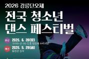 강릉시 청소년수련관은 오는 6월 20일 오후 7시 강릉단오제 수리마당에서 개최되는 ‘2026 강릉단오제 전국 청소년 댄스 페스티벌’의 참가팀을 17일부터 5월 27일까지 모집한다. 청소년 댄스 페스티벌은 세계문화유산 강릉단오제를 통해 청소년들에게 전통문화에 대한 인식을 확산하고, 예술적 재능과 역량을 발휘할 수 있는 무대를 제공하기 위해 마련됐다. 참가 대상은 9세부터 18세까지의 전국 청소년으로 구성된 댄스팀으로, K-POP, 스트릿댄스, 힙합 등 다양한 장르의 퍼포먼스로 참여할 수 있다. 참가팀은 예선(동영상 심사)을 거쳐 본선 진출 10개 팀이 선발되며, 본선 경연은 6월 20일 오후 7시 강릉단오제 수리마당 특설무대에서 진행된다. 총상금 490만 원 규모로 대상 수상팀에게는 200만 원이 수여된다. 참가 신청은 강릉시청소년수련관 홈페이지 공지사항을 통해 신청서를 내려받아 작성 후 예선 영상과 함께 이메일로 제출하면 된다. 강미정 시 인구가족과장은 “청소년들이 강릉단오제라는 전통문화 축제 속에서 주체적으로 참여하고 성장할 수 있는 기회”라며, “전국 청소년들의 많은 관심과 참여를