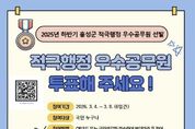 홍성군이 ‘2025년 하반기 적극행정 우수공무원 선발’을 위해 오는 9일까지 국민권익위원회 ‘국민생각함’ 플랫폼에서 온라인 주민 투표를 진행한다. 부서·직원·국민 추천을 통해 선정된 적극행정 우수사례를 대상으로 지역과 관계없이 누구나 참여할 수 있다. 투표 참여는 국민생각함 웹사이트에 로그인한 뒤 본인 인증을 거쳐 ‘생각모음’ 메뉴에서 ‘홍성군 적극행정’을 검색하면 가능하며, 제시된 10개 우수사례 가운데 3건을 선택하는 방식으로 진행된다. 투표 대상으로는 ▲지역 먹거리를 세계 무대로 확장하는 글로벌 관광 콘텐츠 모델 구축 ▲발로 뛰며 23년 묵은 지적불부합지 문제 해결 ▲고향사랑기금을 활용해 취약계층의 치과 치료 지원 ▲소외 없는 민생회복을 위한 소비쿠폰 지급 등 다양한 적극행정 사례가 포함됐다. 이번 온라인 주민 투표 결과는 전체 평가의 30%가 반영되며, 나머지 70%는 실무진 심사 결과를 합산해 본선에 진출할 우수 사례를 선정한다. 이후 2차 대면 심사와 적극행정위원회 의결을 거쳐 최종적으로 5건 내외의 우수 사례가 결정될 예정이다. 김태옥 기획감사담당관은 “적극행정은 공무원의 노력뿐 아니라