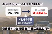 천안시는 지난해 5월 총인구 70만 명을 돌파한 이후 증가세를 이어가며 2019년 이후 최대 인구 증가 기록을 경신했다고 15일 밝혔다. 지난해 12월 말 기준 천안시 총인구(외국인 포함)는 지난해 같은 기간보다 7,544명(1.1%) 늘어난 70만 4,843명으로 집계됐다. 이는 2019년 이후 연간 증가치 중 최대 증가한 수치로 분석된다. 천안시 총인구는 지난해 5월 70만 403명을 기록한 이후 7월(785명), 9월(1,088명), 10월(666명) 등 매월 꾸준한 증가세를 보였다. 특히 9월에는 한 달 사이 1,000명 이상이 늘어나며 증가세가 가장 두드러졌다. 인구 통계적 지표 개선도 눈에 띈다. 지난해 출생아 수(3,711명)가 사망자 수(3,591명)를 앞지르며 3년 만에 ‘인구 데드크로스’를 극복했다. 천안시는 출산 친화적 사회분위기 확산을 위해 ▲7남매 다둥이 맘인 김소정 씨 출산장려 홍보대사 위촉 ▲출산장려 릴레이 캠페인 전개 ▲초중고 및 읍면동 찾아가는 인구교육 확대 운영 등 시민 인식제고 활동도 함께 추진해 정책효과를 높였다. 시는 임산부 교통비 50만 원 지원