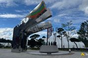 영동세계국악엑스포조직위는 영동세계국악엑스포 개막과 함께 행사장 내에 설치된 상징조형물인 ‘전통의 울림, 미래를 울리다’의 제막식을 26일 개최했다고 밝혔다. 이날 제막식에는 국악엑스포 공동위원장인 정영철 영동군수, 윤영달 크라운해태 회장을 비롯해 민의식 국악 엑스포 집행위원장, 신현광 영동군의회 의장 등 주요 내빈이 참석해 자리를 빛냈다. 국악엑스포 상징조형물은 복합문화예술회관 옆에 높이 6미터, 세로 8.7미터, 가로 6.7미터 규모로, 금속 조각가 심병건 작가가 제작했다. ‘ㄱ’자 기울기에서 가장 맑은 소리를 내는 115도로 깎는 편경을 모티브로 하여 제작된 기하학적 구조의 세 개의 기둥은 국악이 지닌 맑고 청아한 울림을 형상화한다. 또, 음의 파동과 리듬으로 시각화된 율관과 한국 고유의 정체성을 의미하는 오방색 띠로 열린 세계를 향해 뻗어 나가는 에너지를 나타낸다. 세 개의 기둥과 함께, 중앙의 상단에 편종과 편경을 의미하는 파이프를 조형하여 ‘울림과 진동’이 이곳에서 시작돼 세상에 울려 퍼져나감을 표현했다. 16개의 편종은 관람객들이 각각을 두드려 직접 울림과 진동을 느끼며 한국의 소리와 문