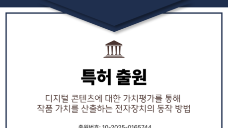 ㈜디지털가치인증센터(대표 김정균)는 디지털 콘텐츠의 작품 가치를 공정하게 평가하기 위한 핵심 기술을 특허청에 정식 출원(출원번호 10-2025-0165744)했다고 밝혔다. 이번 발명은 디지털 아트, 영상, 음원 등 다양한 디지털 창작물의 예술적·기술적 특성을 종합적으로 분석해 작품의 객관적 가치를 산출하는 평가 체계를 제시한다. 특히 기존 시장이 단순 거래가나 NFT 민팅 가격에 의존하던 한계를 보완하여,작품의 창의성, 예술성, 희소성, 평판 등 다양한 요소를 종합적으로 고려함으로써디지털 자산의 공정하고 균형 잡힌 가치 판단 기준을 마련했다. 디지털가치인증센터는 이번 출원을 통해, AI 기술과 전문가 검증이 상호보완적으로 작동하는 가치평가 방법을 기반으로 콘텐츠의 신뢰도와 시장 투명성을 높이는 방향의 기술적 토대를 구축했다고 설명했다. 김정균 대표는 “이번 특허 출원은 디지털 창작물의 공정한 가치평가를 제도화하는 첫걸음이 될 것이라 생각합니다. 기술이 예술의 본질을 대신하는 것이 아니라, 창작자가 정당한 대우를 받을 수 있도록 돕는 역할을 하게 될 것입니다.”라고 밝혔다. 디지털가치인증센터는 해당 기술을 바탕으로 AI 기반 감정평가 플랫폼 ‘이터널스 오스(