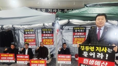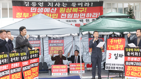 경기도의회 국민의힘 소속 안전행정위원회와 경제노동위원회 의원들이 27일 기자회견을 열고 김동연 경기도지사의 예산안 편성과 도정 운영을 강도 높게 비판하며 투쟁 의지를 재확인했다. 3일째 투쟁, 당 지도부도 동참이용호 의원은 이날 1,420만 경기도민을 향한 회견에서 "김동연 지사의 민생예산 삭감과 정무·협치 라인의 행정사무감사 거부에 대응하기 위한 우리 국민의힘의 투쟁이 오늘로 3일째에 접어들었다"고 밝혔다. 백현종 대표의원은 결연한 의지를 담아 삭발을 단행한 뒤 단식농성을 이어가고 있다. 중앙당 차원의 지원도 이어지고 있다. 양향자 국민의힘 최고위원은 이날 최고위원회의 모두발언을 통해 "백현종 대표의원의 투쟁은 정치보다 민생, 선거보다 도민을 먼저 생각하자는 절박한 호소"라며 "부디 힘내달라. 민주와 민생을 지키는 투쟁에 당 지도부가 함께 하겠다"고 힘을 실었다. '이증도감' 예산안 강력 비판국민의힘 의원들은 이번 예산안을 '이증도감(李增道減)'이라 명명하며 강하게 반발하고 있다. 이는 '이재명표 정치성 예산은 증액하고, 도민 복지예산은 대폭 삭감했다'는 의미를 담고 있다. 이용호 의원은 "이번 예산안은 명백한 전형적인 정치 편향 예산"이라며 "무엇보다 도
