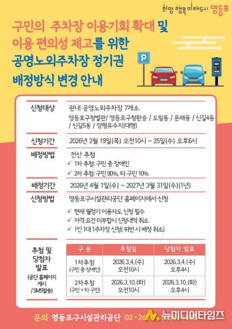 영등포구가 관내 공영노외주차장 7개소에 대한 정기권 신청을 ‘선착순 순환배정제’에서 ‘구민 우선 전산추첨 순환배정제’로 변경해 오는 19일부터 25일까지 접수한다고 밝혔다.