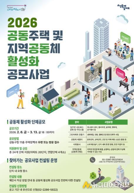 서울 성동구는 공동주택과 지역사회의 소통과 협력을 강화하고, 주민 주도의 공동체 문화를 확산하기 위해 ‘2026년 공동주택 및 지역공동체 활성화 공모사업’에 참여할 단지(단체)를 모집한다고 밝혔다.