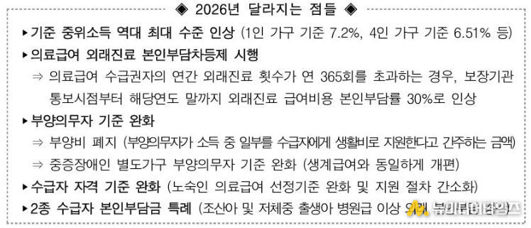특히 2026년에는 *기준 중위소득이 역대 최대 수준으로 인상됨에 따라 의료급여 수급 대상이 확대된다.