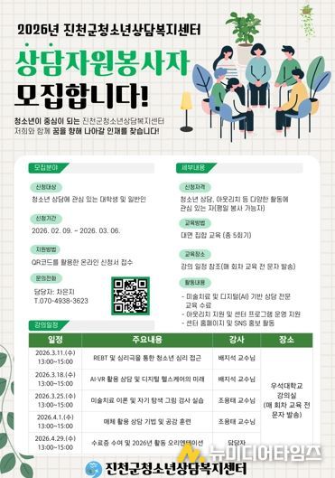 충북 진천군 청소년상담복지센터는 관내 위기 청소년 지원 역량 강화를 위해 ‘2026년 상담자원봉사자 양성 교육’ 참여자를 모집한다고 18일 밝혔다.