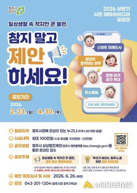 청주시는 시민의 창의적인 아이디어를 시정에 반영하기 위해 2월 23일부터 4월 30일까지 ‘2026년 상반기 시민 테마아이디어 공모전’을 개최한다.