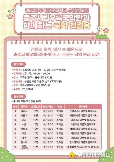 충주시립우륵국악단은 ‘제27회 우륵당 문화학교’를 오는 3월부터 8월까지 약 6개월 간 운영한다고 19일 밝혔다.