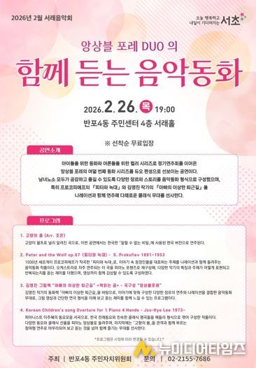 반포4동 주민자치위원회가 주최하는 이번 행사는 피아노 듀오 ’앙상블 포레 DUO‘가 선보이는 음악동화 콘서트로 지역 주민들에게 다채로운 음악적 경험을 제공하고자 마련됐다. 아이들을 위한 동화 형식과 어른들을 위한 클래식 감성을 함께 담아 남녀노소 모두가 공감하고 즐길 수 있는 무대가 꾸며질 것으로 기대된다.