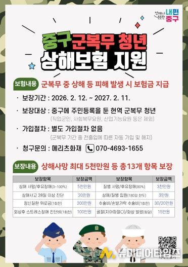 구 관계자는 “군 복무 중인 청년들이 건강하고 안전하게 사회로 복귀할 수 있도록 상해보험을 마련하게 됐다”며, “나라를 지키고 미래를 준비하는 청년들에게 중구가 든든한 힘이 될 수 있도록 체감도 높은 정책을 지속적으로 추진해 나가겠다”고 말했다.