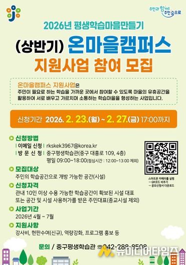 대전 중구는 주민이 마을 내 공간에서 서로 배우고 가르치며 소통하는 평생학습 생태계 조성을 위해 오는 23일부터 27일까지 2026년 상반기 온마을캠퍼스 지원사업 참여 기관 10개소를 모집한다고 밝혔다.