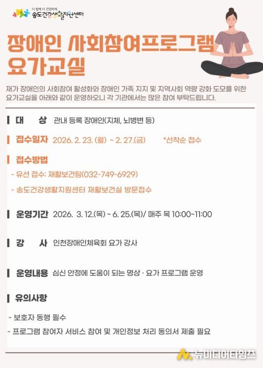 연수구 송도건강생활지원센터는 사회참여 기회가 부족한 재가 장애인의 외부 활동을 독려하기 위해 ‘2026년 장애인 사회참여 프로그램’ 참여자를 모집한다.