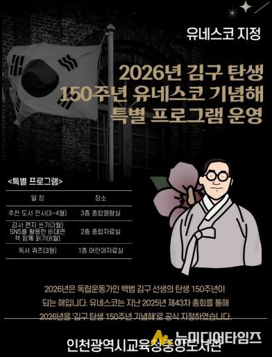 인천광역시교육청중앙도서관은 ‘김구 탄생 150주년 유네스코 기념의 해’를 맞아, 백범 김구 선생의 삶과 정신을 기리고 시민의 역사의식을 함양하기 위한 기념행사를 3월부터 8월까지 운영한다.