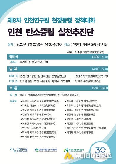 인천연구원은 인천녹색환경지원센터와 함께 2월 25일 오후 2시, 인천대학교 미래관 세미나실에서 인천 탄소중립 실천추진단을 출범시키고, 시민참여 방안 마련을 주제로 '제8차 인천연구원 현장동행 정책대화'를 공동 개최한다.