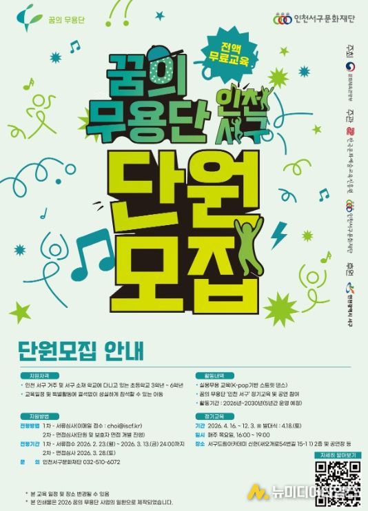 인천서구문화재단은 문화체육관광부가 주최하고 한국문화예술교육진흥원이 주관하는 2026년 '꿈의 무용단 ‘인천 서구’' 사업의 신규 거점기관으로 선정됨에 따라, 지역 아동·청소년을 대상으로 단원 25명을 공개 모집한다.