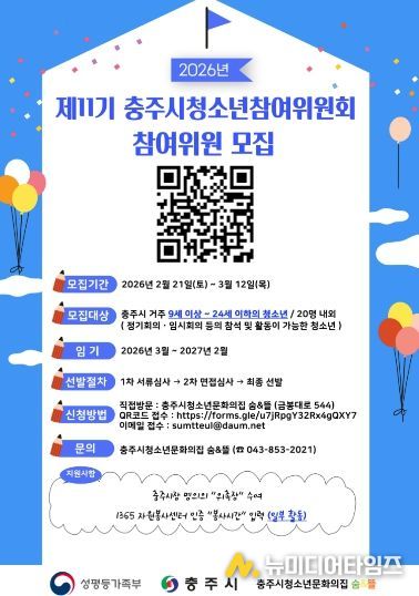 충주시청소년문화의집 숨&뜰은 충주시 청소년들의 목소리를 시정에 반영하고 청소년 정책을 함께 만들어 가기 위해 2026년 제11기 충주시청소년참여위원회 위원을 모집한다고 밝혔다.