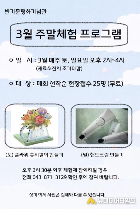 음성군 제8대 유엔사무총장 반기문 평화기념관에서는 관람객을 위한 3월 주말 무료 체험 프로그램을 운영한다.