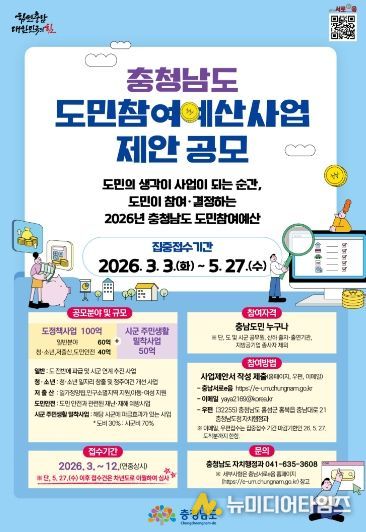 충남도는 3월 3일부터 5월 27일까지 2027년 예산안에 반영할 ‘도민참여예산 제안사업’ 집중 접수기간을 운영한다고 26일 밝혔다.