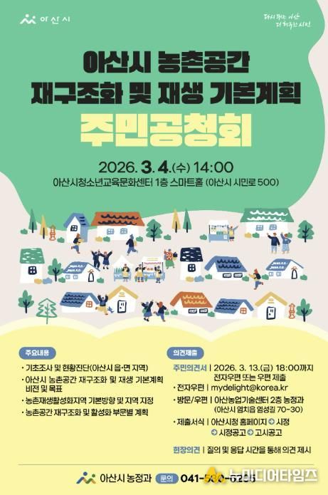 아산시는 '농촌공간 재구조화 및 재생 기본계획' 수립과 관련해 지역 주민과 관계 전문가의 의견을 수렴하기 위한 주민공청회를 오는 3월 4일 오후 2시, 아산시 청소년교육문화센터 1층 스마트홀(시민로 500)에서 개최한다.