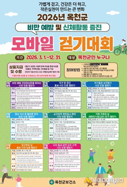 옥천군보건소는 지역주민의 일상 속 걷기 실천율을 높이고 건강증진을 도모하기 위해 ‘2026년 옥천군 모바일 걷기대회’ 커뮤니티를 운영한다고 밝혔다.