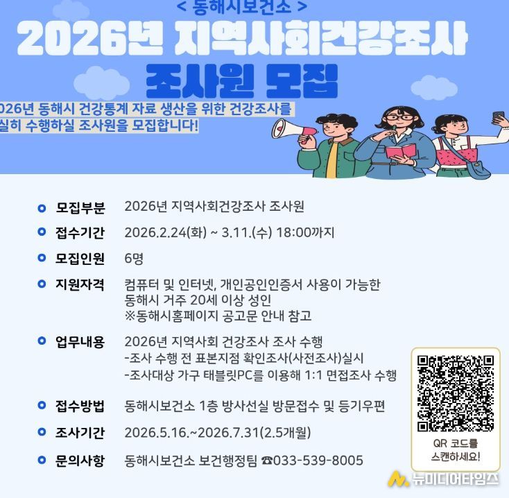 동해시는 질병관리청, 연세대학교 원주의과대학과 함께 수행하는 ‘2026년 지역사회 건강조사’에 참여할 조사원 6명을 모집한다고 밝혔다.