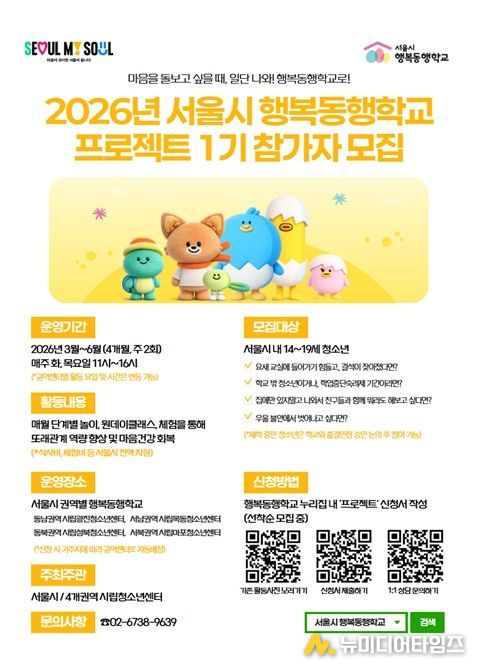 청소년 행복동행학교는 상담 위주의 기존 방식에서 벗어나, 청소년들이 또래와 자연스럽게 어울리며 성취감을 느낄 수 있는 놀이와 활동 중심의 통합지원을 제공한다. 2024년 2개 센터(목동, 서대문) 시범운영을 시작으로 2025년에는 청소년종합지원센터 중심의 4개 센터(목동, 성북, 마포, 광진)로 확대 운영했다. 올해는 총 4개 과정, 약 1,200명을 대상으로 확대 모집하여 고립‧은둔 청소년이 사회적 관계를 회복할 수 있도록 돕는다.