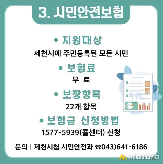제천시는 예기치 못한 사고와 재난으로 피해를 입은 시민들의 생활 안정과 일상 회복을 지원하기 위한 시민안전보험을 전년도와 동일한 조건으로 올해도 갱신해 운영한다고 밝혔다.