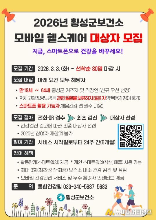 횡성군보건소는 지역주민의 만성질환 예방과 건강한 생활 습관 형성을 돕기 위해 ‘2026년 모바일 헬스케어 사업’ 참여자 80명을 선착순 모집 중이라고 밝혔다.