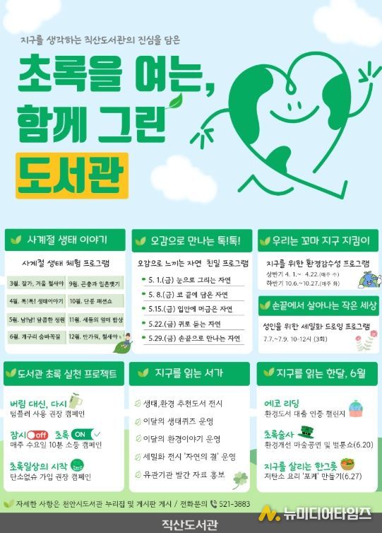 천안시 직산도서관이 올해 생태와 환경을 주제로 ‘초록을 여는, 함께 GREEN 도서관’을 운영한다고 4일 밝혔다.