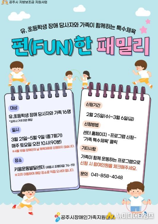 공주시 장애인가족지원센터는 오는 6일까지 장애인 가족을 대상으로 가족특수체육 프로그램 ‘펀(Fun)한 패밀리’ 참여자를 모집한다.