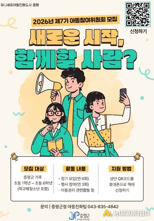 충북 증평군이 아동의 시선에서 지역 정책을 함께 만들어갈 ‘제7기 증평군 아동참여위원회’ 위원 35명을 오는 3월 31일까지 공개 모집한다.