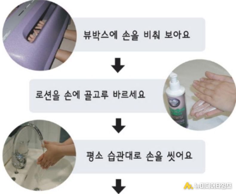 손세정 교육기인 ‘뷰박스’는 형광 로션을 오염물질로 가정해 손에 바른 뒤 특수 조명 아래에서 세정 상태를 확인하는 장비다. 손 씻기 전에는 형광 물질이 선명히 드러나고, 올바른 방법으로 30초 이상 비누를 사용해 손가락 사이와 손톱 밑까지 씻은 후에는 잔여 오염 부위를 확인할 수 있다. 이를 통해 스스로 부족한 부분을 인지하고 개선하도록 유도한다.
