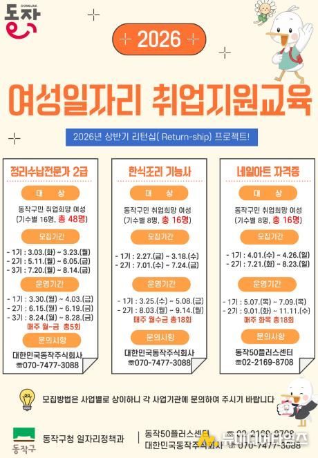 박일하 동작구청장은 “이번 리턴십 프로젝트가 다시 일하고 싶은 여성과 중장년층의 취업역량 강화에 실질적인 도움이 되길 바란다”며 “앞으로도 구민들이 체감할 수 있는 맞춤형 일자리 정책을 지속적으로 확대해 나가겠다”고 말했다.