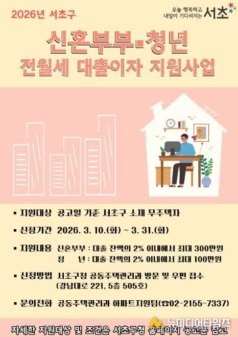 서울 서초구가 가파른 대출 금리 인상과 주거비 부담으로 어려움을 겪고 있는 무주택 신혼부부와 청년들에게 ‘2026년 전월세 보증금 대출이자 지원사업’을 시행한다고 밝혔다. 전월세 보증금 대출이자 지원사업은 경제적 자립 기반이 약한 무주택자 신혼부부와 청년들의 안정적인 정착을 돕기 위해 전월세 보증금 대출이자를 신혼부부에게는 연 300만 원, 청년에게는 연 100만 원까지 지원하는 사업이다.
