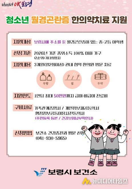 보령시는 월경곤란증으로 어려움을 겪는 여성 청소년들의 건강한 성장과 올바른 건강관리를 돕기 위해 한의약 치료비 지원사업을 추진하고 있다.