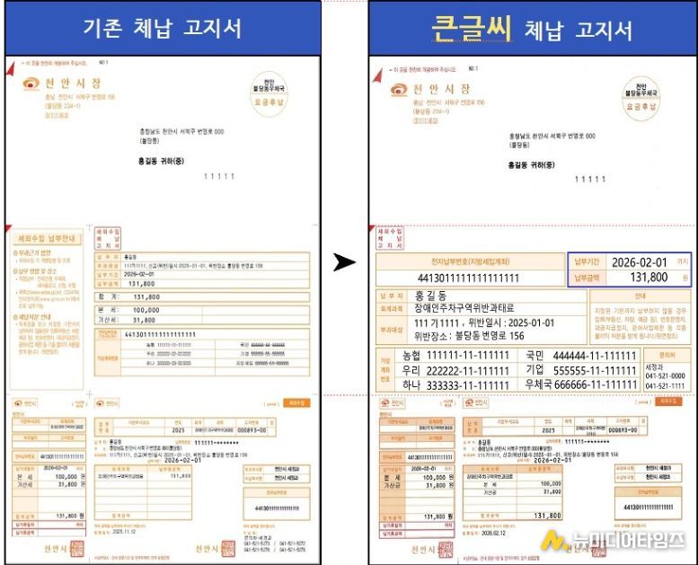 천안시는 납부자가 고지 내용을 한눈에 쉽고 정확하게 파악할 수 있도록 세외수입 체납고지서에 글자 크기를 대폭 확대한 ‘돋보기 고지서’를 도입한다고 6일 밝혔다.