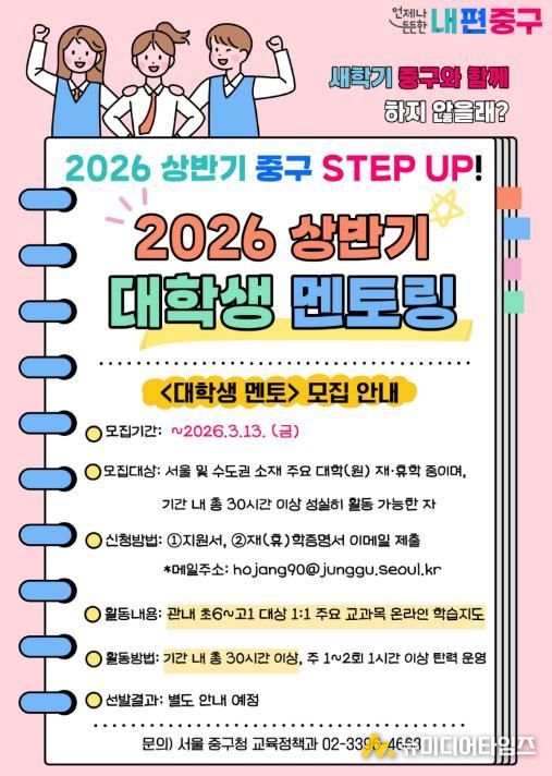 서울 중구가 청소년들의 학습과 진로 고민을 풀어줄 ‘대학생 멘토링’을 올해도 운영한다. 상반기에는 멘토와 멘티 각각 70명을 선발하며, 참여를 원하는 학생은 오는 13일까지 신청하면 된다.