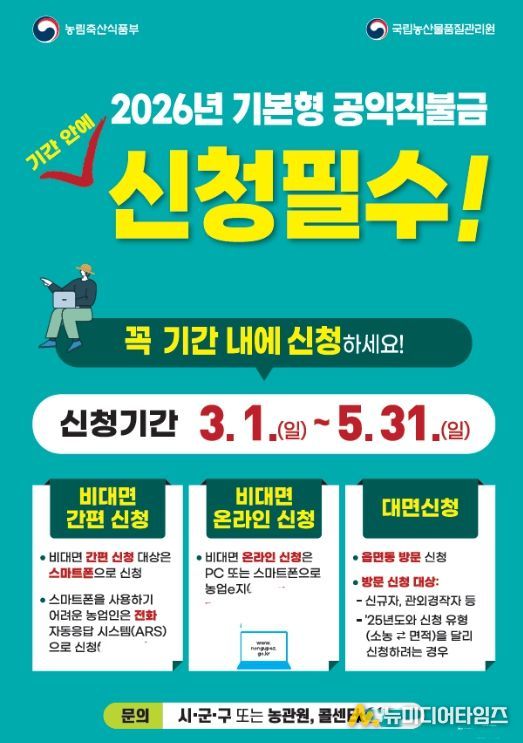 충남 계룡시는 3월부터 오는 5월 31일까지 2026년 기본형 공익직불제(이하 공익직불제) 신청을 접수한다고 밝혔다.