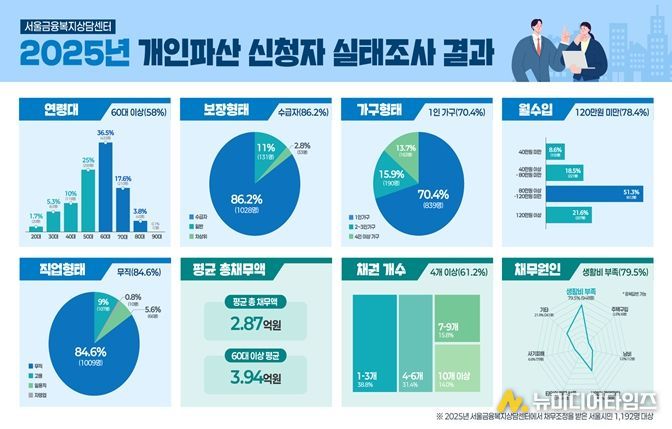 서울시복지재단 서울금융복지상담센터는 지난해 센터로 접수된 개인파산 신청 유효 데이터 1,192건을 분석한' 20025년 개인 파산면책 지원 실태'를 9일 발표했다.