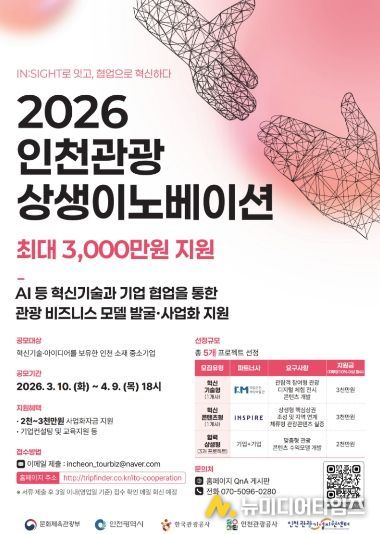 인천광역시와 인천관광공사(사장 유지상, 이하 공사)는 지역 관광 활성화와 관광기업 성장 지원을 위해 '2026년 인천관광 상생이노베이션'사업의 참여기업을 모집한다고 밝혔다.