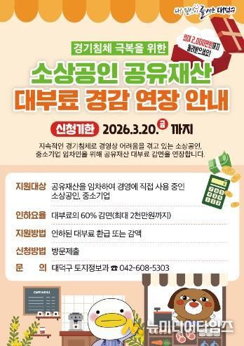 대덕구 관계자는 “지속되는 경기침체로 어려움을 겪는 지역 소상공인의 부담을 덜기 위해 지난해에 이어 대부료 감면 정책을 연장 추진하게 됐다”며 “앞으로도 지역경제 회복과 소상공인 경영 안정을 위한 지원 정책을 마련하겠다”고 말했다.