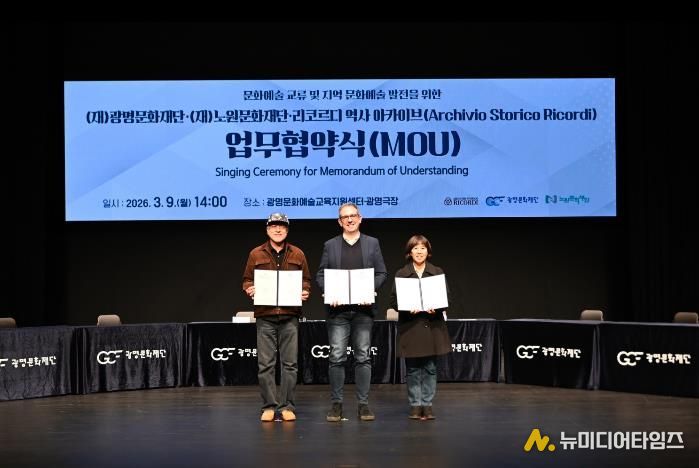 (재)광명문화재단은 3월 9일 오후 2시 광명극장에서 (재)노원문화재단, 리코르디 역사 아카이브(Archivio Storico Ricordi)(이하 리코르디)와 ‘문화예술 교류 및 지역 문화예술 발전’을 위한 업무협약(MOU)을 체결했다고 밝혔다.