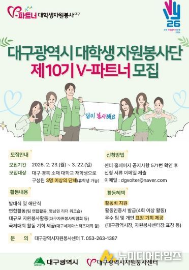 대구광역시는 대구광역시자원봉사센터와 함께 지역사회 혁신과 자원봉사 문화 확산을 이끌어갈 ‘제10기 V(Volunteer)-파트너 대학생 자원봉사단’ 참여자를 오는 3월 22일까지 모집한다.