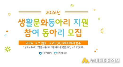 인천광역시와 인천문화재단은 인천 시민들의 자발적인 문화예술 활동을 지원하기 위해 '2026 생활문화동아리 지원' 사업을 추진한다.
