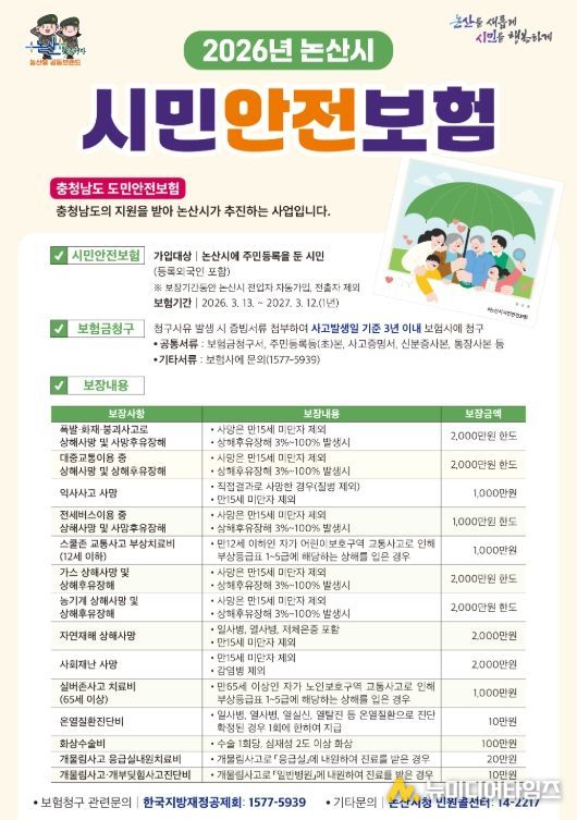 논산시는 시민들이 일상생활 중 발생할 수 있는 각종 재난과 안전사고에 대비하기 위해 시민 안전 보험을 운영하고 있다.