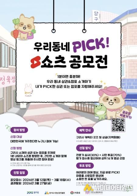 구리시상권활성화재단은 구리시 상권의 다양한 매력을 알리기 위해 ‘우리동네 PICK! 시민캠페인’ 쇼츠(Shorts) 공모전을 개최하고, 오는 3월 12일부터 18일까지 공모 접수를 진행한다고 밝혔다.