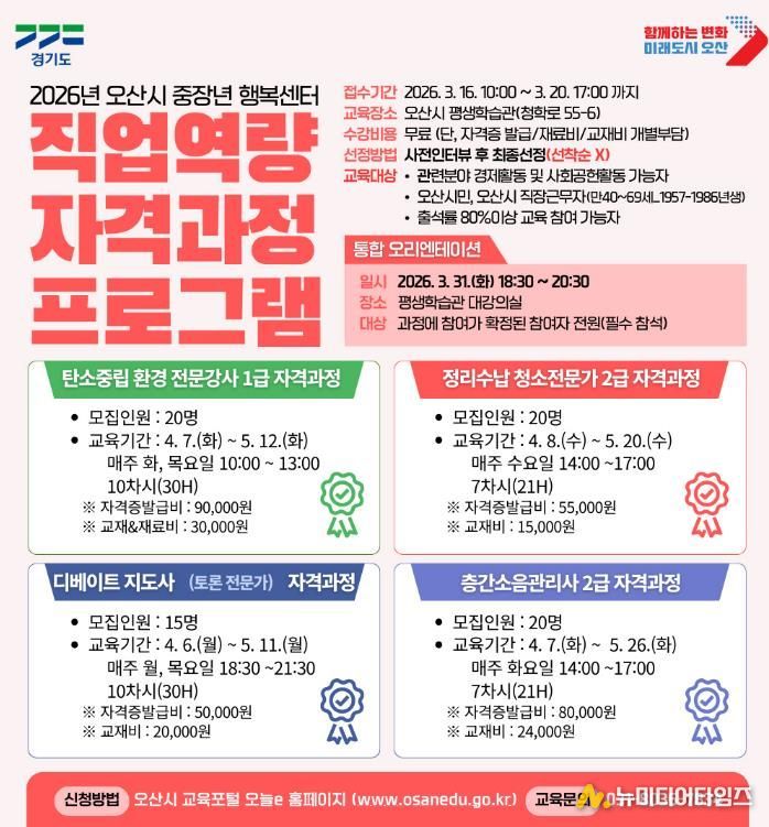 오산시는 중장년층의 경제활동 참여 확대와 사회공헌 기회 제공을 위해 ‘2026년 오산시 중장년 행복센터 직업역량 자격과정 프로그램’ 수강생을 모집한다고 밝혔다.