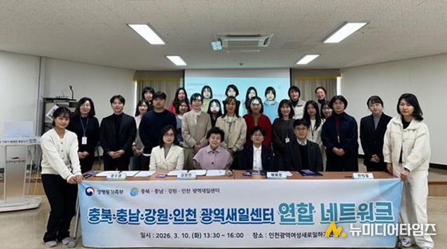 (재)인천여성가족재단 인천광역여성새로일하기센터는 2026년 3월 10일 오후 1시 30분, 재단 소강당에서 강원광역여성새로일하기센터, 충북광역여성새로일하기센터, 충남광역여성새로일하기센터와 함께 ‘중부권 광역여성새로일하기센터 연합 네트워크 구축을 위한 다자간 업무협약'을 체결했습니다.